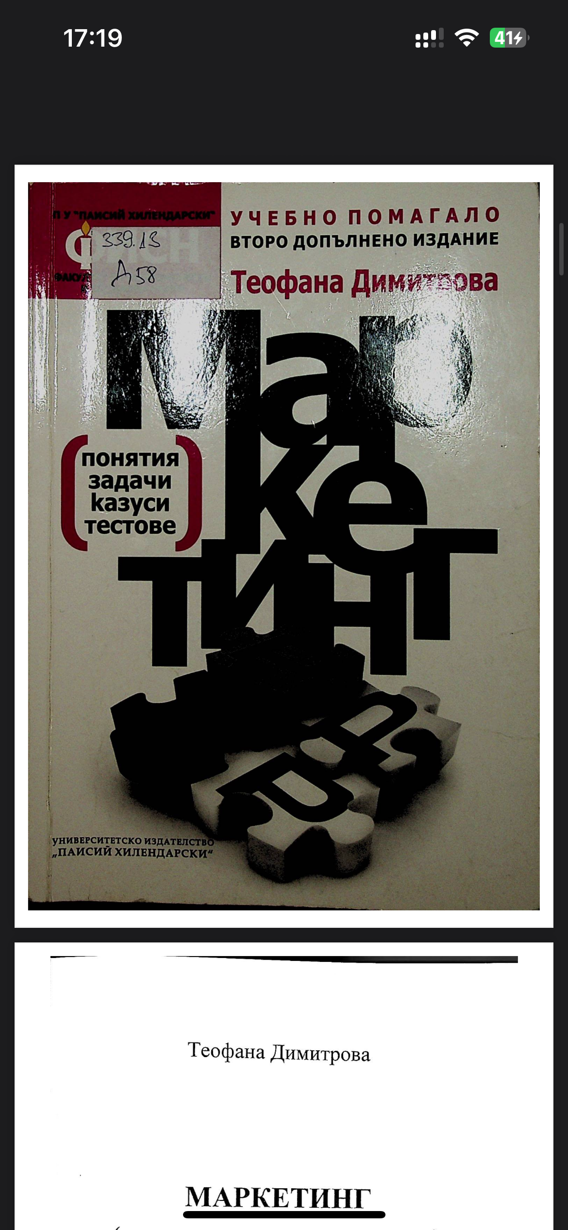 Здравейте, колеги! Предстои ми изпит по Маркетинг (втори курс). Аз съм в Пловдивския университет и преподавателката ми е Теофана Димитрова. Случайно някой от вас да има учебника ѝ и би бил добър/ра да го сподели, защото наистина е много трудно да се учи за нейните изпити!!! Пускам снимка на учебника ѝ, ако някой го има, моля да се свърже с мен!!!